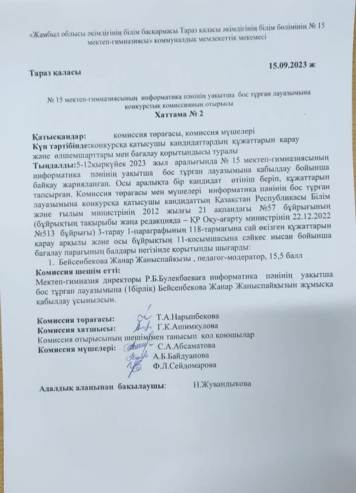 Уақытша бос орындарға конкурс отырысы » Школа Гимазия №15