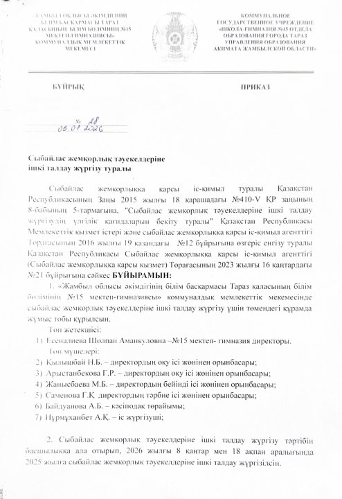 Сыбайлас жемқорлық тәуекелдеріне ішкі талдау жүргізу туралы бұйрық » Школа Гимазия №15