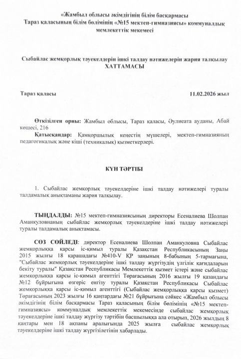 11 февраль 2026 0 1 2 3 4 5 Сыбайлас жемқорлық тәуекелдерін ішкі талдау нәтижелерін жария талқылау ХАТТАМАСЫ