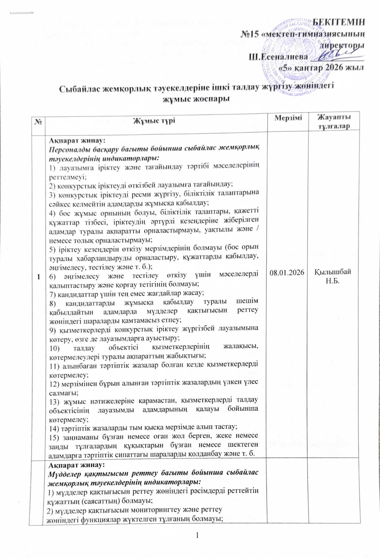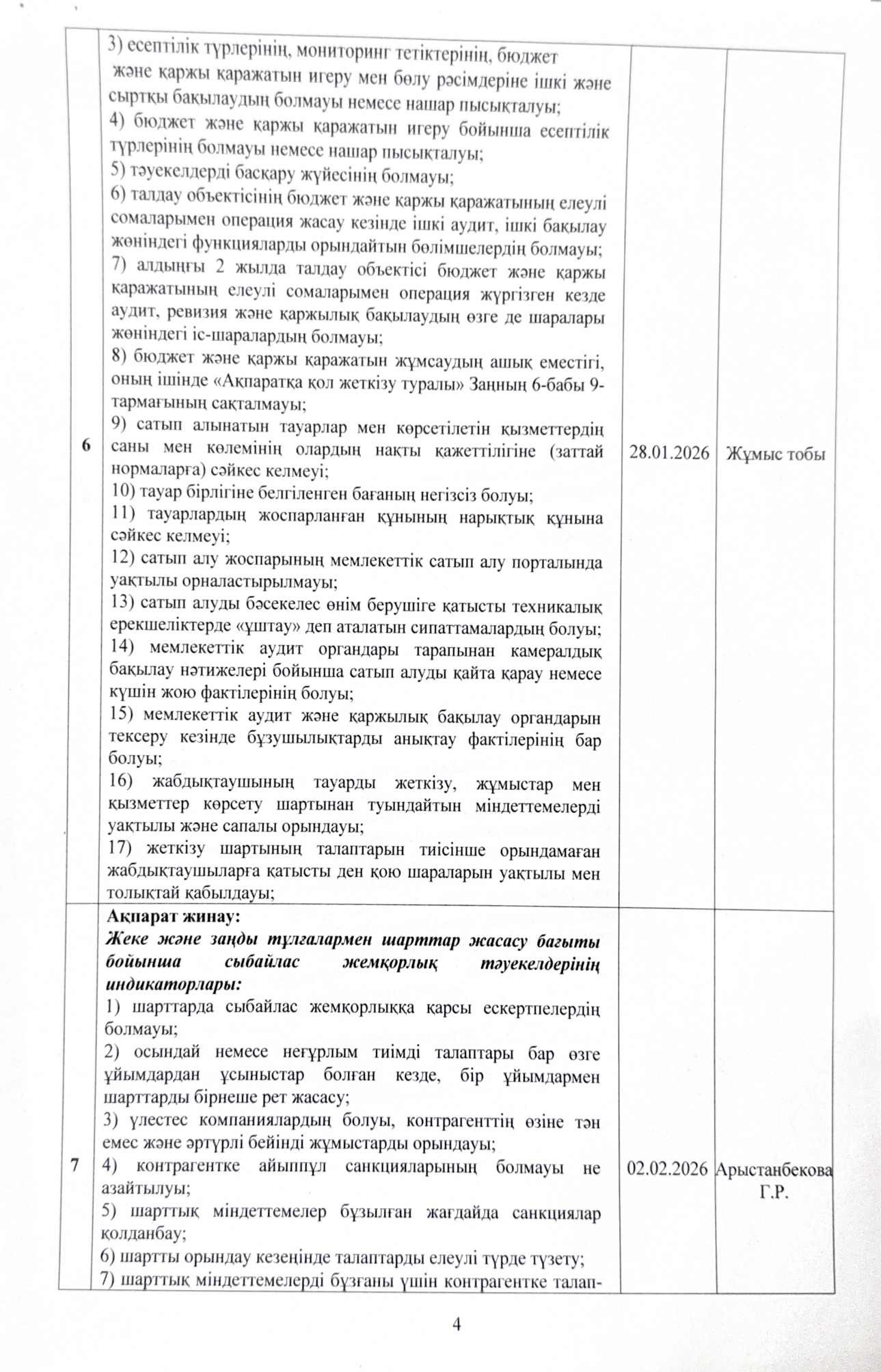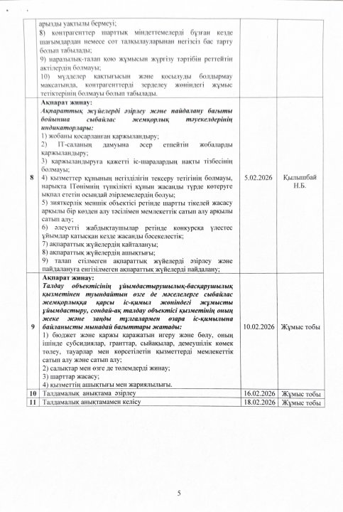 05 январь 2026 0 1 2 3 4 5 Сыбайлас жемқорлық тәуекелдеріне ішкі талдау жүргізу жөніндегі жұмыс жоспары
